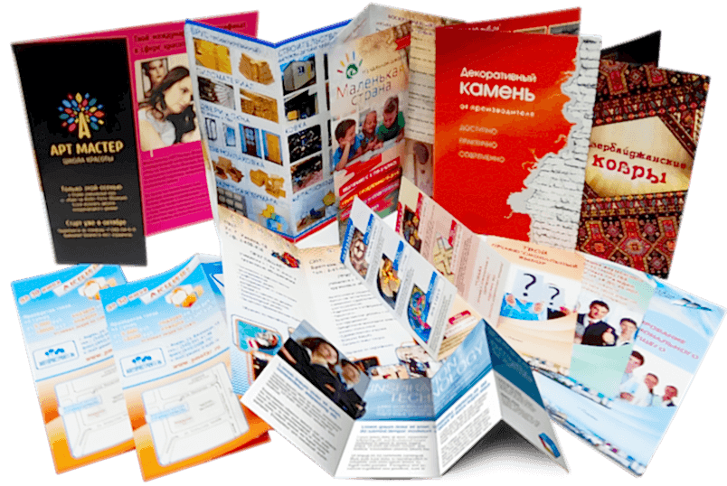 Цветные брошюры печатаются на А4 и А3, отпечатанные листы обычно сгибаются таким образом, чтобы итоговый размер материала не превышал формата А5.